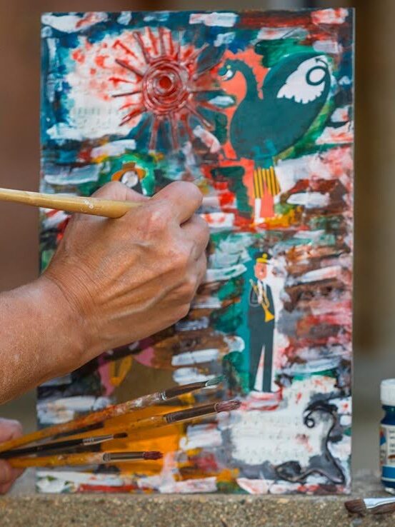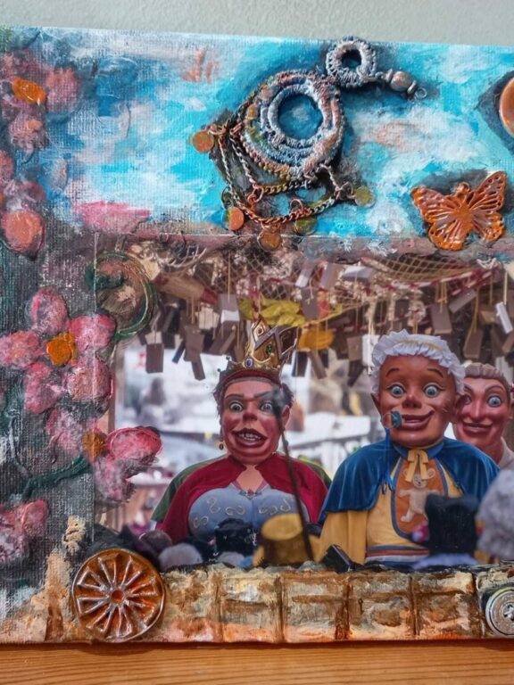 • Pintures: tecnica mix media, combinació de foto i materials reciclats com puntes de roba, botons, claus etc.